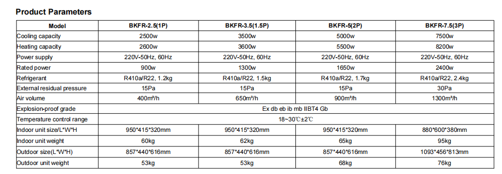 BKFR series explosion-proof is designed to prevent or contain any internalexplosion and prevent it from spreading to the surrounding atmosphere.Explosionproof level is ⅡA~ⅡB, and the temperature is T1~T4 ,they can work in flammablegas,steam and air with explosive gas area which need to cooling and dehumidifying.Its used in in hazardous chemical warehouse, workshop, modulation room,ammunition depot , chemical , military,oil platform and other flammable and explosiveenvironment.